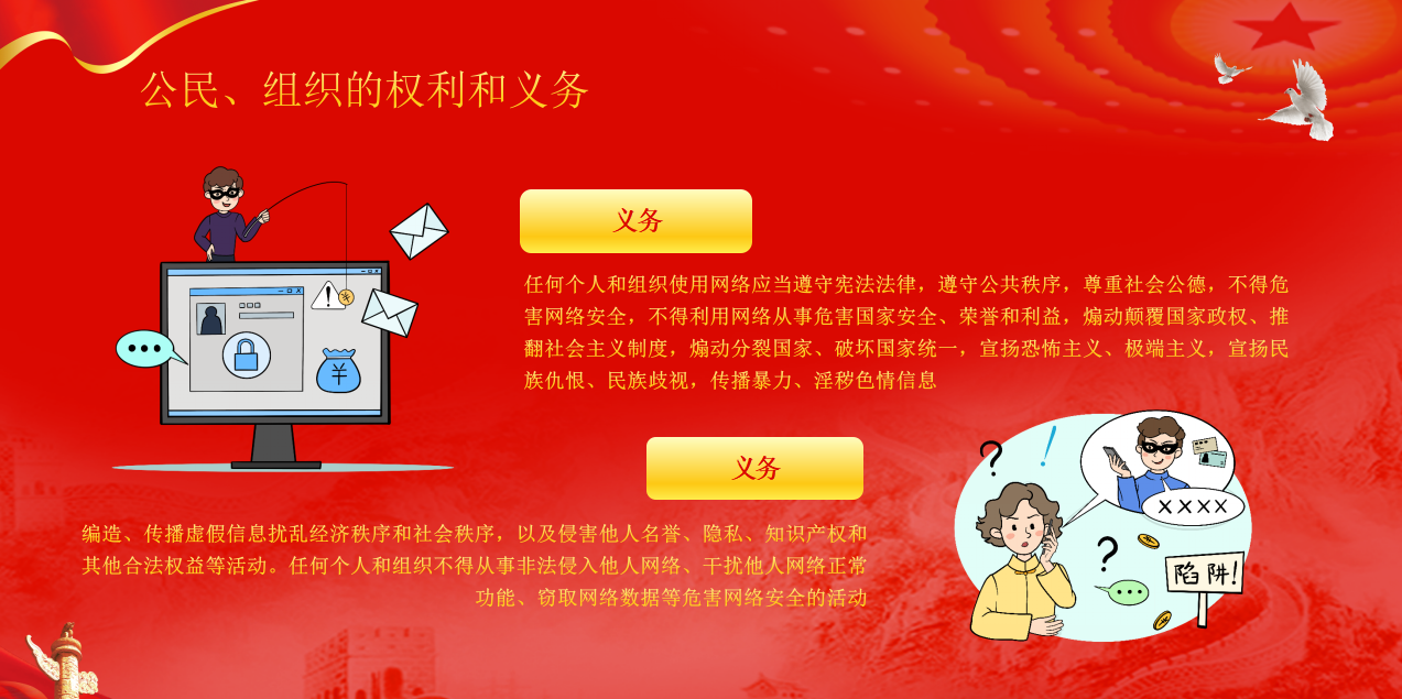 在網(wǎng)絡(luò)安全保障體系中,公民與組織依法享有的權(quán)利可分為"積極權(quán)利"與"消極權(quán)利"兩大維度,這兩類權(quán)利共同構(gòu)筑了網(wǎng)絡(luò)空間的權(quán)益保護(hù)網(wǎng)。網(wǎng)絡(luò)安全不是某一個人的事,而是我們每個人都要守護(hù)的共同責(zé)任。作為公民和組織,在網(wǎng)絡(luò)空間里該怎么做、不該怎么做,其實有著清晰的“行為指南”。我們可以把這些責(zé)任分成三個層面來記:首先是必須守住的“底線義務(wù)”,其次是絕對不能碰的“禁止行為”,最后是千萬別忽視的“協(xié)助責(zé)任”。